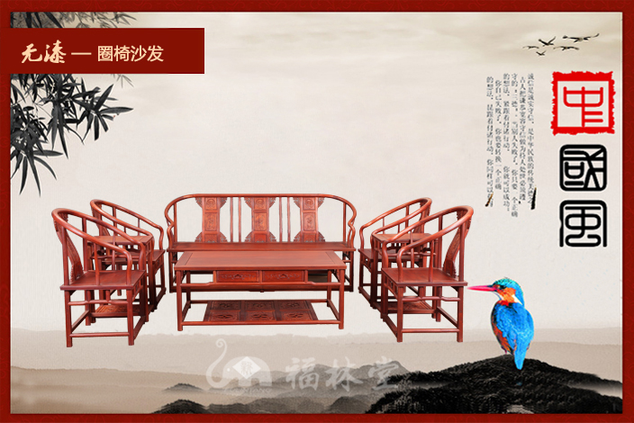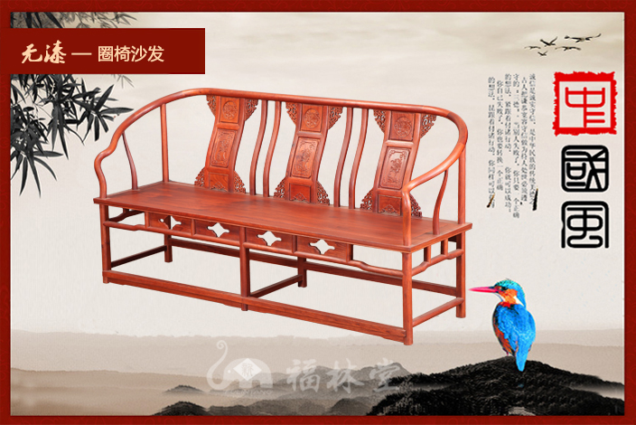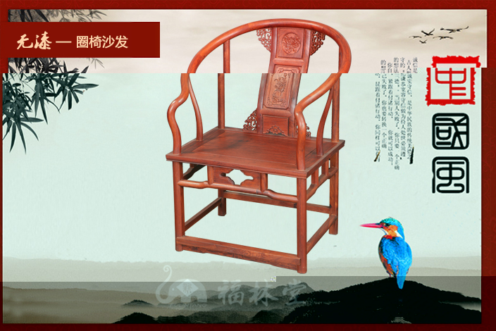圈椅,因椅圈恰似羅圈,民間又稱“羅圈椅”或“圓椅”,圈椅的造型上圓下方,外圓內方,這暗和了中國傳統文化中的乾坤之說,乾為天為圓,坤為地為方,而外圓內方則是中國傳統文化中所崇尚的一種品德,雖在處事上有所圓滑但卻內在有所堅持。它最明顯的特征則是在圈背上連結著扶手,從高到低一順而下,座靠時可使人的臂膀都倚著圈形的扶手,感到十分舒適,頗受人們喜愛!