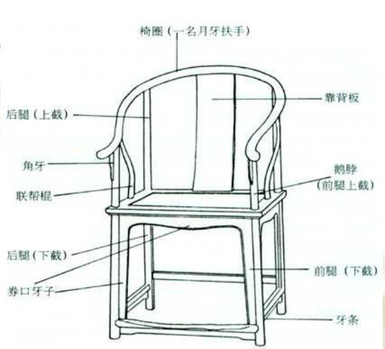 關(guān)于圈椅的結(jié)構(gòu)構(gòu)造,我們就用最經(jīng)典也是最原始的明式圈椅作為描述對象,它的每個(gè)結(jié)構(gòu)構(gòu)造以及命名術(shù)語包括: