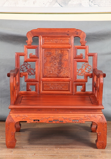 沙發大略的細節紋飾圖案均雕繪在了正面的靠背板處,在其它部位,除了座位面四周的墊面處以及四只座腳的表面有幾些邊條紋飾稍加修幅外,都不加任何的修飾,極盡木材原始之紋路,真實而自然。扶手處的設計線條感極具曲線美,并在側面同樣以多處面積的鏤空作為處理,與沙發整體之設計風格保持了一致,譬如屏風給人的感覺一般,隱約中透露著含蓄之美,這也是中國風理念的一處極好展現。