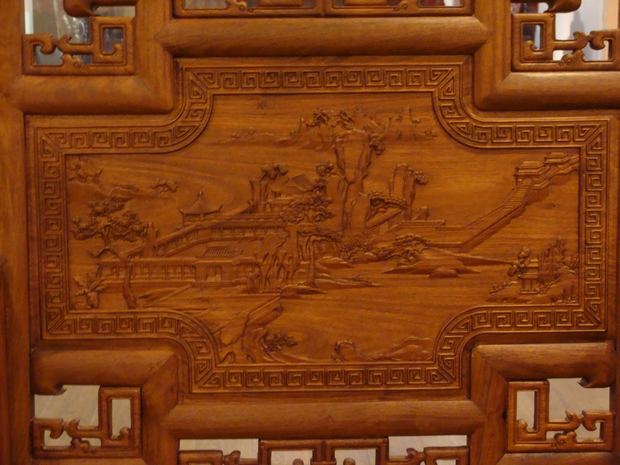 平直的背板正面中央是為一呈十字交叉分布的方形圖案,其畫面清秀唯美、矯健的松柏依悉而立,倚圍墻靠山野云海而居的亭臺樓宇景觀更突顯著不俗的文人情懷雅致,而遠處為云霧所繚繞的山峰高聳林立,顯得十足地巍峨壯觀,整幅畫面遠景近景層次分明,脈絡清晰,如同一幅絕美的文人畫映入眼簾,置身于畫中,可以感受到那股空透悠遠,清幽絕塵,遠離世俗塵囂的意境,浮縷于間。而在該處十字方形圖案靠背板處的背面則還雕繪有一大字體形狀的“福”字圖案,圖案四周為彎延的呈軸對稱分布的花環所圍繞,顯得十分美艷,