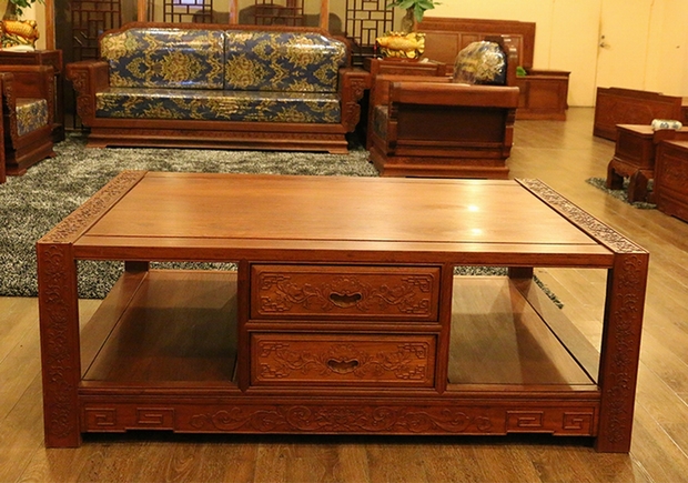 其他幾個部件:二人座長沙發處之紋飾設計以及大體形態與單人座沙發大致保持了一致;而在高幾部分,除牡丹花紋飾外另還能看見的還有元寶圖案雕飾,雕繪于上方抽屜層面左右前方位置處,意帶有“滾滾財源”“吉祥富貴”之寓意;同樣在大平幾位置的紋飾也同高幾一同,而平滑顯著淡雅光澤的桌面更覺舒適。