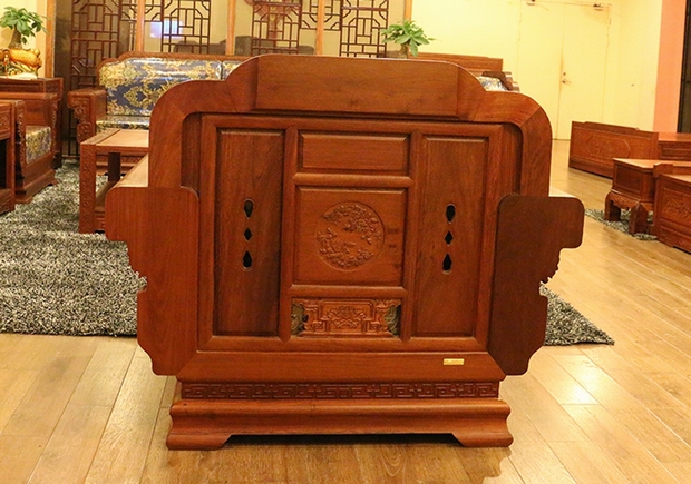 接下來我們來看看沙發各處的具體細節,遠看單人座沙發整體給人的感覺就好比一含苞待放鮮艷嬌貴的花朵,木質構造處的座椅面顯得十分地低矮,以及加上高度近乎不計的椅腳設計,使之整座沙發的氣韻更顯柔美婉約;左右“兩片”向外伸展而開的扶手就好比那光艷的花瓣一般,給人以無限的遐思,正前方處象征著“富貴”之氣的牡丹浮雕紋飾脫穎而出,雕刻紋理處理溫柔細膩清晰,盛開在沙發座椅的前方,顯得極為秀麗惹目;沙發最上端部分的靠背板呈現以一“凸”字形設計,拐角處處理圓潤平滑,而在其前方位置處也還另雕繪有一欄邊幅牡丹花紋,走筆于其板面邊緣,綿延而浮縷于不絕,富貴嬌艷。最后再說說沙發的背面部分,一框整而平易的木面之上,內嵌有一“H”型字母形狀的邊幅,正中央方形位置內還幅畫有一圓形的牡丹花卉紋飾,大略也呈上下對稱分布,而在其方形木面的下方,也還雕飾有些許鏤空留余的一朵大牡丹紋飾,上下兩處雕飾與整體沙發所要闡述的“富貴”主題風格所暗合,花開富貴。