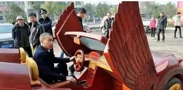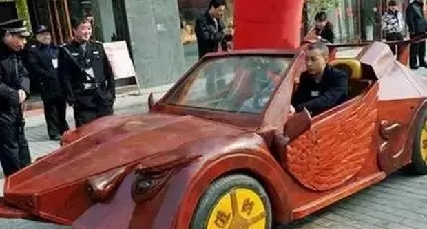 千萬別小看了坐在這個紅木跑車里的小哥,人家可是土豪!據說光制作該紅木跑車就花費了幾十萬,耗時半年多,真會玩